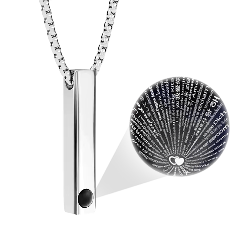 Le pendentif utilise la technologie de gravure nano-micro pour projeter « Je t'aime » en 100 langues différentes. Une expérience exquise et une surprise que tout le monde adorerait. Disponible uniquement chez Gifted Lux™.
