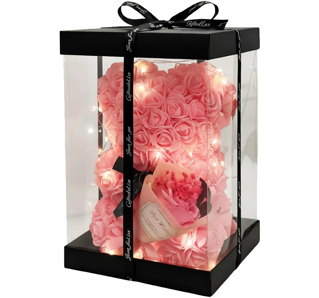 The perfect gift for all occasions to make anyone feel appreciated and loved. Securely & neatly packed. A glowing pink rose bear awaits inside, for a breathtaking surprise.